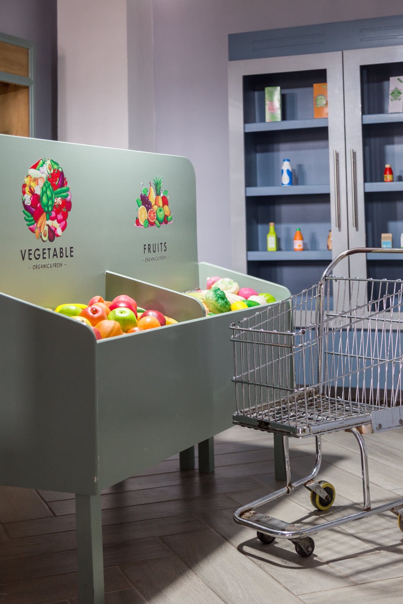 Supermercado con productos, carritos reales y caja registradora.